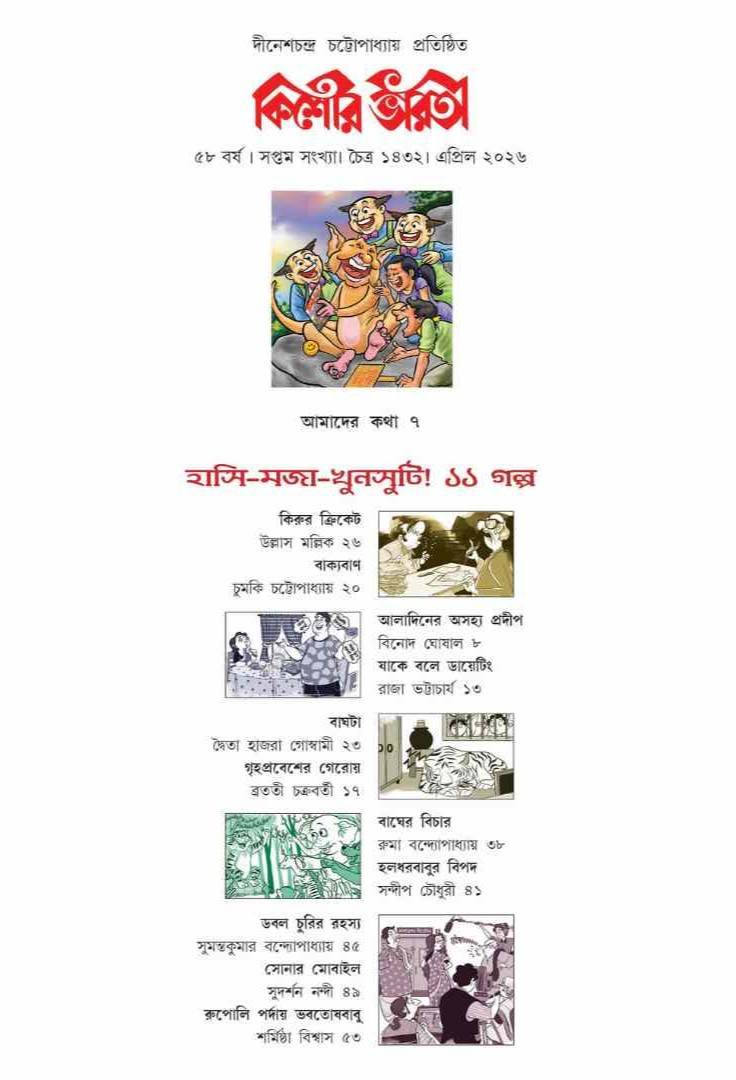 A laugh-riot issue featuring 11 funny stories by Ullash Mallick, Binod Ghoshal, Raja Bhattacharya, Chumki Chatterjee, Dwaita Hazra Goswami, Bratati Chakraborty, Ruma Bandyopadhyay, Sandip Choudhury, Sumanta Kumar Bandyopadhyay, Sudarshan Nandi and Sharmishtha Biswas. This apart, featuring comics/graphic novels including Arjuner Rahasya by Samares Mazumdar, Jagumamar Bipokkhe Jagumama by Tridib Chatterjee, Banku Daktar by Dr.Sayan Pal and Bondhumama by Ritam Ghoshal. Featuring Jana theke Ajana by Rajarshi Sarkar and Chora – Kobita by Kaji Murshidul Arefin, Mukul Maity, Kaji Shamsul Alam and Udayshankar Bag. Featuring the usual columns and articles of Tomra Bolcho & Magajabdo !