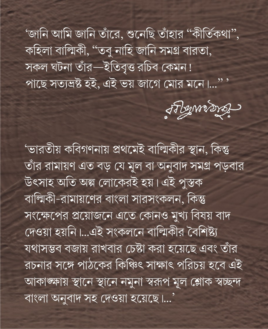 | ‘ ভারতীয় কবিগণনায় প্রথমেই বাল্মিকীর স্থান, কিন্তু তাঁর রামায়ণ এত বড় যে মূল বা অনুবাদ সমগ্র পড়বার উৎসাহ অতি অল্প লোকেরই হয় ৷ এই পুস্তক বাল্মিকী-রামায়ণের বাংলা সারসংকলন, কিন্তু সংক্ষেপের প্রয়োজনে এতে কোনও মুখ্য বিষয় বাদ দেওয়া হয়নি ৷...এই সংকলনে বাল্মিকীর বৈশিষ্ট্য যথাসম্ভব বজায় রাখবার চেষ্টা করা হয়েছে এবং তাঁর রচনার সঙ্গে পাঠকের কিঞ ্চিৎ সাক্ষাৎ পরিচয় হবে এই আকাঙ্ক্ষায় স্থানে স্থানে নমুনা স্বরূপ মূল শ্লোক স্বচ্ছন্দ বাংলা অনুবাদ সহ দেওয়া হয়েছে ৷...’ রাজশেখর বসু |
