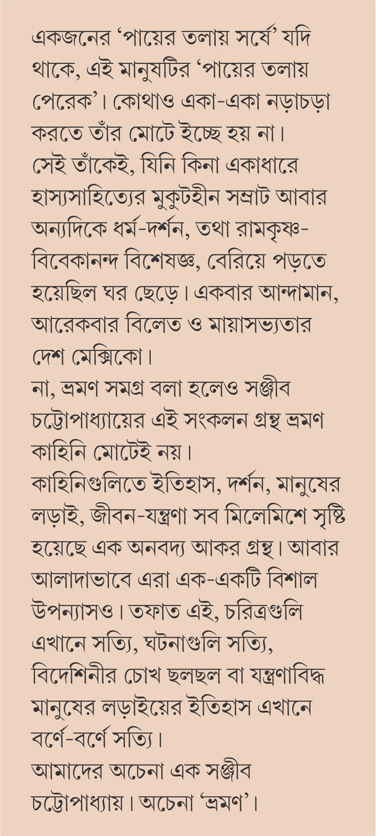 একজনের 'পায়ের তলায় সর্ষে' যদি থাকে, এই মানুষটির 'পায়ের তলায় পেরেক'। কোথাও একা-একা নড়াচড়া করতে তাঁর মোটে ইচ্ছে হয় না। সেই তাঁকেই, যিনি কিনা একাধারে হাস্যসাহিত্যের মুকুটহীন সম্রাট আবার অন্যদিকে ধর্ম-দর্শন, তথা রামকৃষ্ণ- বিবেকানন্দ বিশেষজ্ঞ, বেরিয়ে পড়তে হয়েছিল ঘর ছেড়ে। একবার আন্দামান, আরেকবার বিলেত ও মায়াসভ্যতার দেশ মেক্সিকো। না, ভ্রমণ সমগ্র বলা হলেও সঞ্জীব চট্টোপাধ্যায়ের এই সংকলন গ্রন্থ ভ্রমণ কাহিনি মোটেই নয়। কাহিনিগুলিতে ইতিহাস, দর্শন, মানুষের লড়াই, জীবন-যন্ত্রণা সব মিলেমিশে সৃষ্টি হয়েছে এক অনবদ্য আকর গ্রন্থ। আবার আলাদাভাবে এরা এক-একটি বিশাল উপন্যাসও। তফাত এই, চরিত্রগুলি এখানে সত্যি, ঘটনাগুলি সত্যি, বিদেশিনীর চোখ ছলছল বা যন্ত্রণাবিদ্ধ মানুষের লড়াইয়ের ইতিহাস এখানে বর্ণে-বর্ণে সত্যি। আমাদের অচেনা এক সঞ্জীব চট্টোপাধ্যায়। অচেনা 'ভ্রমণ'।