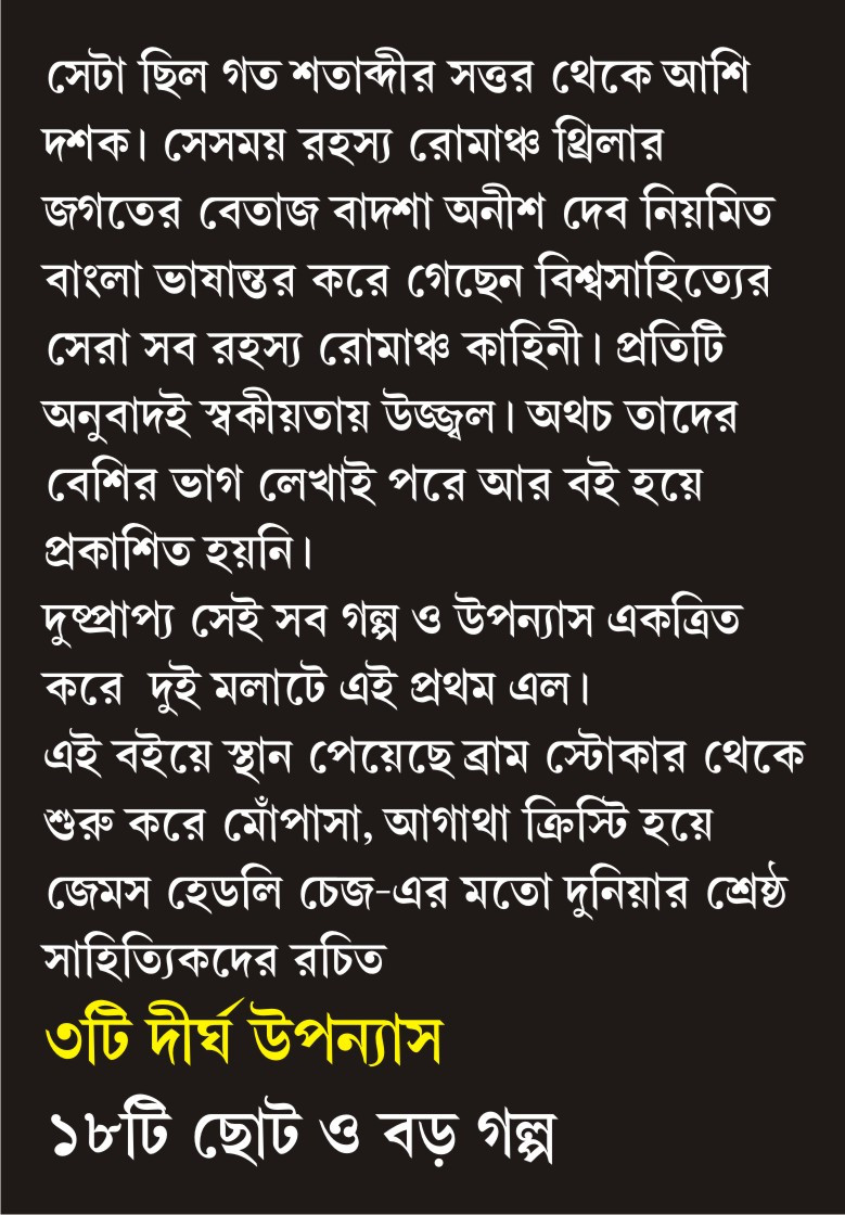 সেটা ছিল গত শতাব্দীর সত্তর থেকে আশি দশক। সেসময় রহস্য রোমাঞ্চ থ্রিলার জগতের বেতাজ বাদশা অনীশ দেব নিয়মিত বাংলা ভাষান্তর করে গেছেন বিশ্বসাহিত্যের সেরা সব রহস্য রোমাঞ্চ কাহিনী। প্রতিটি অনুবাদই স্বকীয়তায় উজ্জ্বল। অথচ তাদের বেশির ভাগ লেখাই পরে আর বই হয়ে প্রকাশিত হয়নি।