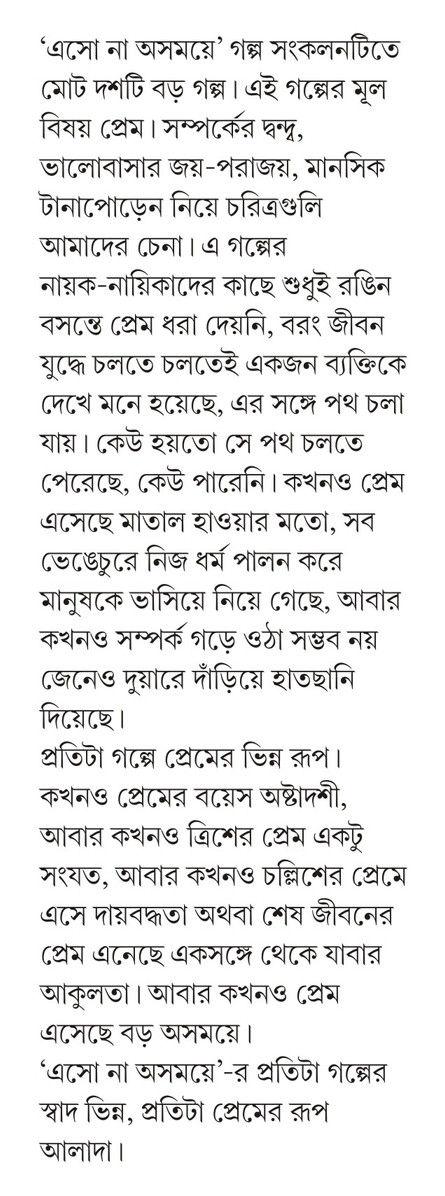 ‘এসো না অসময়ে' গল্প সংকলনটিতে মোট দশটি বড় গল্প। এই গল্পের মূল বিষয় প্রেম। সম্পর্কের দ্বন্দ্ব, ভালোবাসার জয়-পরাজয়, মানসিক টানাপোড়েন নিয়ে চরিত্রগুলি আমাদের চেনা। এ গল্পের নায়ক-নায়িকাদের কাছে শুধুই রঙিন বসন্তে প্রেম ধরা দেয়নি, বরং জীবন যুদ্ধে চলতে চলতেই একজন ব্যক্তিকে দেখে মনে হয়েছে, এর সঙ্গে পথ চলা যায়।কেউ হয়তো সে পথ চলতে পেরেছে, কেউ পারেনি। কখনও প্রেম এসেছে মাতাল হাওয়ার মতো, সব ভেঙেচুরে নিজ ধর্ম পালন করে মানুষকে ভাসিয়ে নিয়ে গেছে, আবার কখনও সম্পর্ক গড়ে ওঠা সম্ভব নয় জেনেও দুয়ারে দাঁড়িয়ে হাতছানি দিয়েছে।প্রতিটা গল্পে প্রেমের ভিন্ন রূপ। কখনও প্রেমের বয়েস অষ্টাদশী, আবার কখনও ত্রিশের প্রেম একটু সংযত, আবার কখনও চল্লিশের প্রেমে এসে দায়বদ্ধতা অথবা শেষ জীবনের প্রেম এনেছে একসঙ্গে থেকে যাবার আকুলতা। আবার কখনও প্রেম এসেছে বড় অসময়ে।