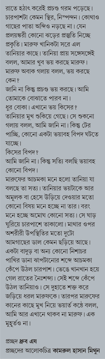 | রাতে হঠাৎ করেই প্রচণ্ড গরম পড়েছে। চারপাশটা কেমন স্থির, নিস্পন্দন। কোথাও গাছের পাতা অব্দিও নড়ছে না। যেন প্রলয়ঙ্করী কোনো ঝড়ের প্রস্তুতি নিচ্ছে প্রকৃতি। মারুফ খানিকটা সরে এল তানিয়ার কাছে। তানিয়া প্রায় সঙ্গেসঙ্গেই বলল, আমার খুব ভয় করছে মারুফ। মারুফ অবাক গলায় বলল, ভয় করছে কেন? জানি না কিন্তু প্রচণ্ড ভয় করছে। আমি তোমাকে বোঝাতে পারব না। ধুর বোকা। এখানে ভয় কিসের? তানিয়ার মুখ শুকিয়ে গেছে। সে শুকনো গলায় বলল, আমি জানি না। কিন্তু টের পাচ্ছি, কোনো একটা ভয়াবহ বিপদ ঘটতে যাচ্ছে। কিসের বিপদ? আমি জানি না। কিন্তু সত্যি বলছি ভয়াবহ কোনো বিপদ। মারুফের আচমকা মনে হলো তানিয়া যা বলছে তা সত্য। তানিয়ার ভয়টাকে আর অমূলক বা হেসে উড়িয়ে দেওয়ার মতো কোনো বিষয় মনে হচ্ছে না তার। বরং মনে হচ্ছে অমোঘ কোনো সত্য। সে ঘাড় ঘুরিয়ে চারপাশে তাকালো। মাথার ওপর অশরীরী উপস্থিতির মতো দুটো আমগাছের ডাল কেমন ছড়িয়ে আছে। একটা বাদুড় বা অন্য কোনো নিশাচর পাখির ডানা ঝাপটানোর শব্দে আচমকা কেঁপে উঠল চারপাশ। ভেঙে খানখান হয়ে গেল রাতের নৈঃশব্দ্য। সেই শব্দে কেঁপে উঠল তানিয়াও। সে দুহাতে শক্ত করে জড়িয়ে ধরল মারুফকে। তারপর মারুফের কানের কাছে মুখ নিয়ে ভয়ার্ত কণ্ঠে বলল, আমি আর এখানে থাকব না মারুফ। এক মুহূর্তও না। |