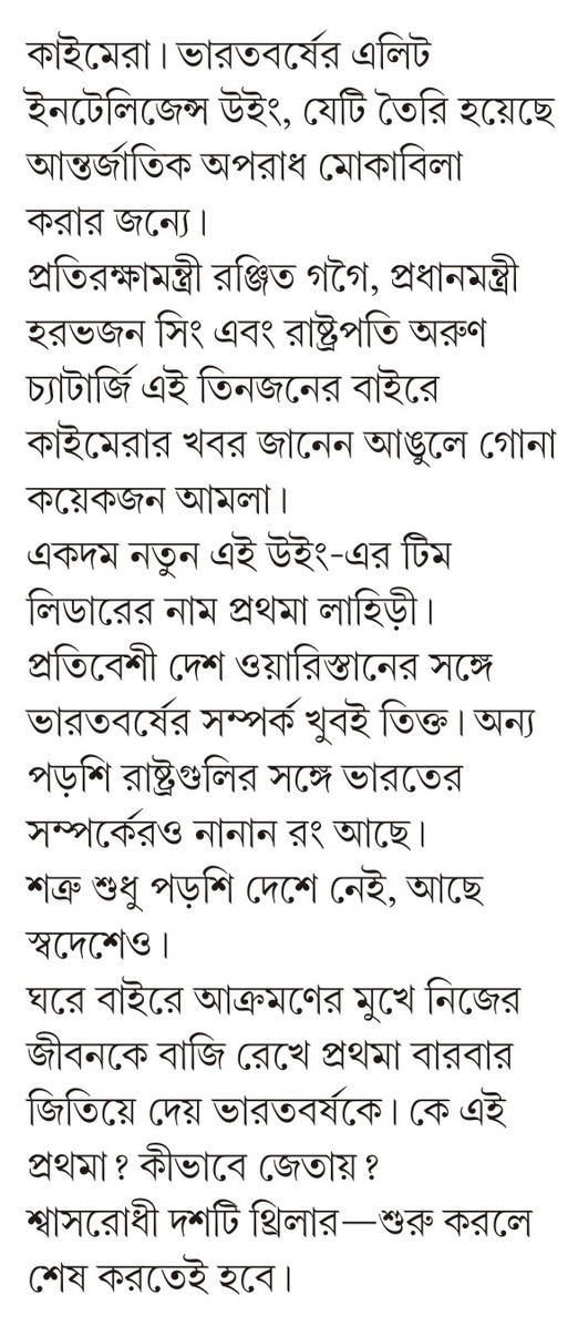 কাইমেরা ৷ ভারতবর্ষের এলিট ইনটেলিজেন্স উইং, যেটি তৈরি হয়েছে আন্তর্জাতিক অপরাধ মোকাবিলা করার জন্যে ৷ প্রতিরক্ষামন্ত্রী রঞ্জিত গগৈ, প্রধানমন্ত্রী হরভজন সিং এবং রাষ্ট্রপতি অরুণ চ্যাটার্জি এই তিনজনের বাইরে কাইমেরার খবর জানেন আঙুলে গোনা কয়েকজন আমলা ৷ একদম নতুন এই উইং-এর টিম লিডারের নাম প্রথমা লাহিড়ী ৷ প্রতিবেশী দেশ ওয়ারিস্তানের সঙ্গে ভারতবর্ষের সম্পর্ক খুবই তিক্ত ৷ অন্য পড়শি রাষ্ট্রগুলির সঙ্গে ভারতের সম্পর্কেরও