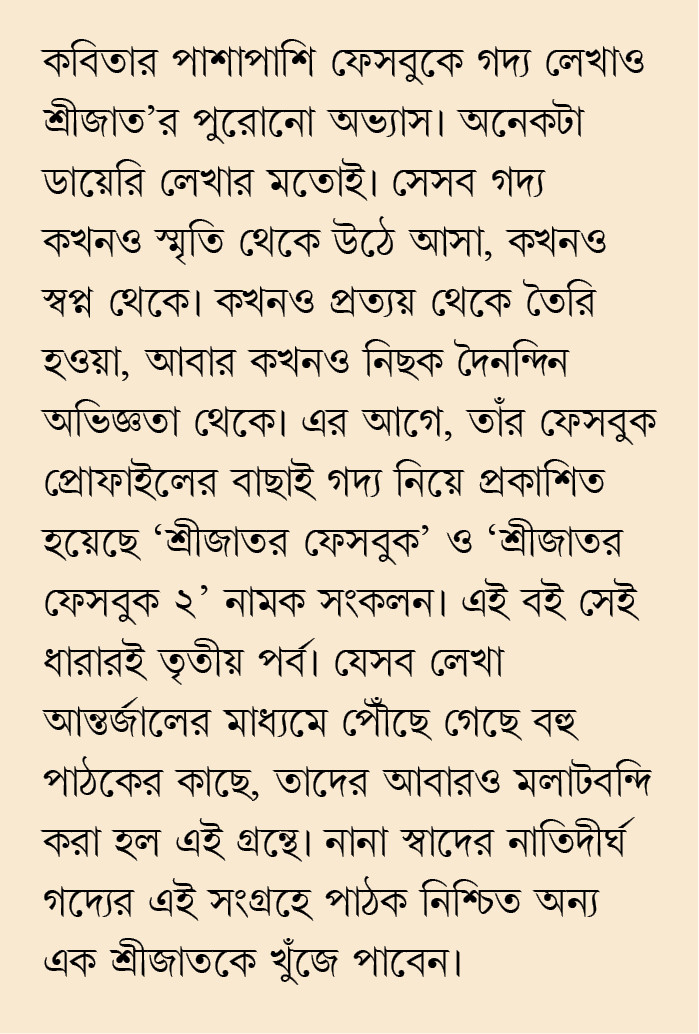 কবিতার পাশাপাশি ফেসবুকে গদ্য লেখাও শ্রীজাত’র পুরোনো অভ্যাস। অনেকটা ডায়েরি লেখার মতোই। সেসব গদ্য কখনও স্মৃতি থেকে উঠে আসা, কখনও স্বপ্ন থেকে। কখনও প্রত্যয় থেকে তৈরি হওয়া, আবার কখনও নিছক দৈনন্দিন অভিজ্ঞতা থেকে। এর আগে, তাঁর ফেসবুক প্রোফাইলের বাছাই গদ্য নিয়ে প্রকাশিত হয়েছে 'শ্রীজাতর ফেসবুক' ও 'শ্রীজাতর ফেসবুক ২' নামক সংকলন। এই বই সেই ধারারই তৃতীয় পর্ব।